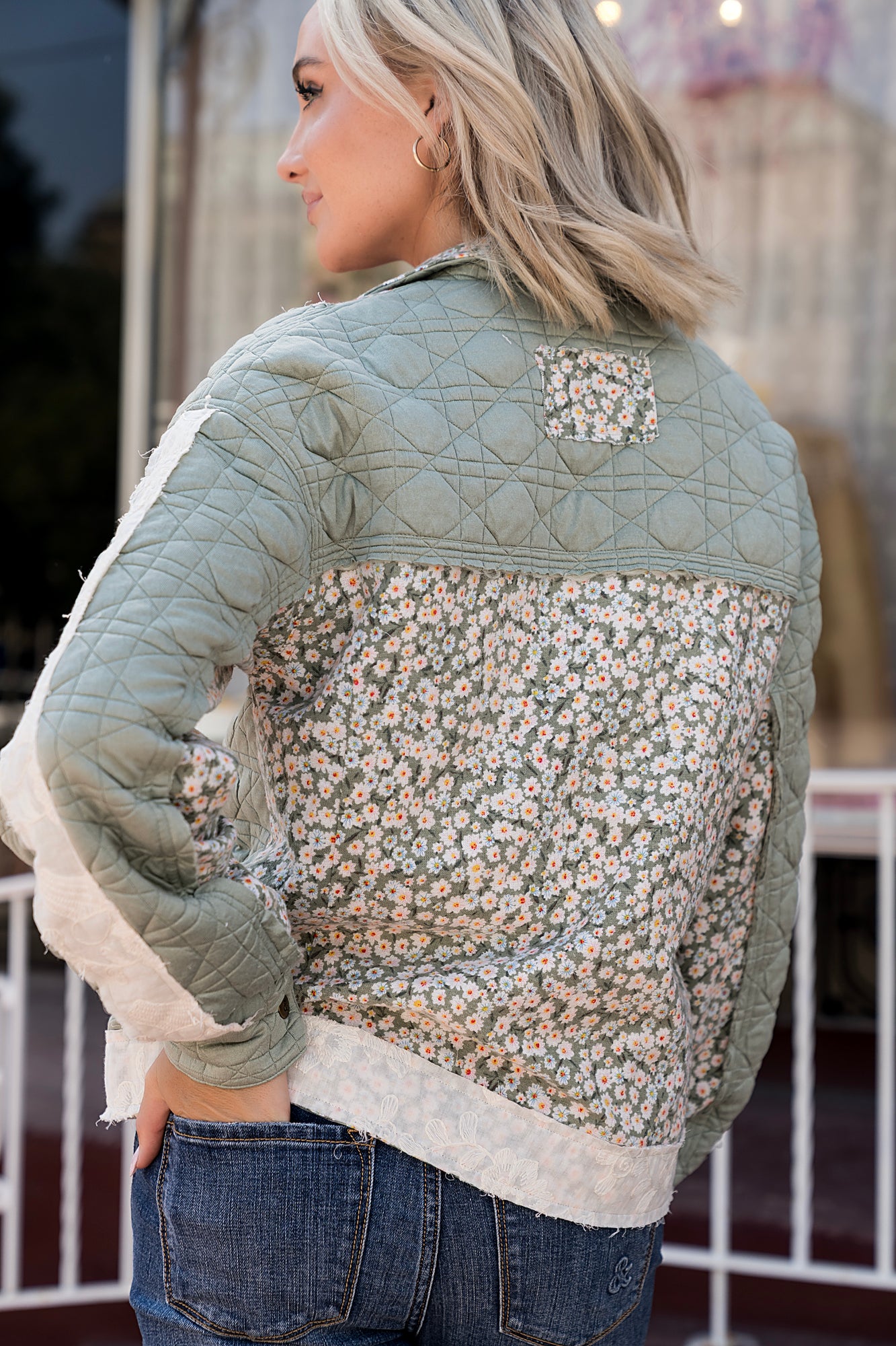 This Bomber Jacket is so good that you’ll never want to take it off. It has a little bit of everything - lace, floral, quilted details and a cute zipper pocket.